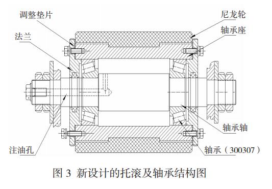 工∑₹♥α(gōng)作(zuò)中,外(wài)圈旋轉,內(n∏↔èi)圈安裝在軸承軸上(shàng)且軸固定在支架上(shàng)不(bπ©ù)動。原滾揉機(jī)托滾及其軸承安裝結構見(jiàn)圖 ₽ ¶↑2。新設計(jì)的(de)滾揉機(jī)托滾及其軸承✔δ結構見(jiàn)圖 3。